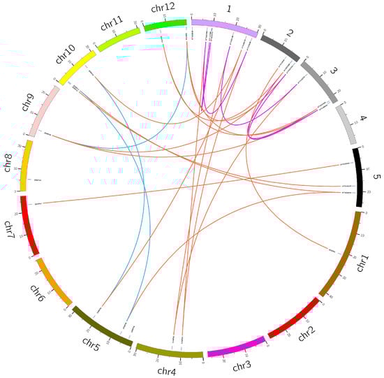 The homologous gene pairs between Z. jujuba Mill. Dongzao and Arabidopsis with Circus. Red, purple and blue lines indicate homologous gene pairs between Z. jujuba Mill. Dongzao and Arabidopsis, and Arabidopsis and Z. jujuba Mill. Dongzao.