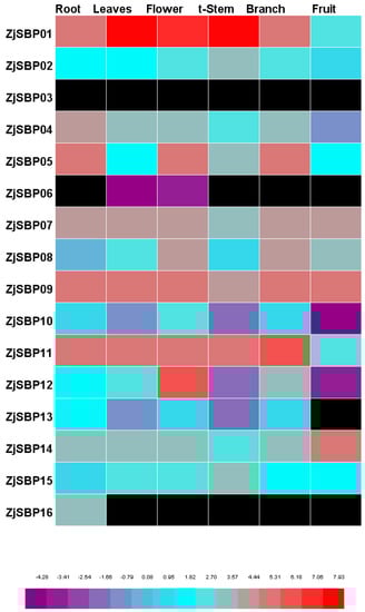 The expression levels of each of the genes in different tissues are shown in Figure 8. According to the FPKM value, most genes expressed clearly in all tissues except for ZjSBP03, ZjSBP06, ZjSBP13 and ZjSBP16. ZjSBP01 reached clearly higher levels in s-stem and leaves. ZjSBP06 only expressed in leaves and flowers and ZjSBP16 only expressed in the root. The expression value of ZjSBP13 was zero in fruit. The transcript of ZjSBP16 was zero in all tissues samples.