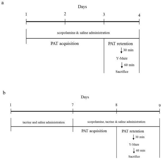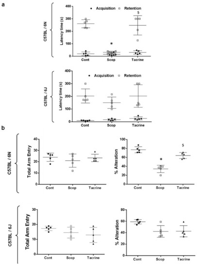 The grouping of C57BL/6N (6N) and C57BL/6J (6J) comparison study includes control (n = 7), scopolamine 2 mg/kg (n = 7), and tacrine 10 mg/kg (n = 7). All animals were orally administered with distilled water (control and scopolamine) or tacrine for seven days prior to scopolamine injection. On day 8, scopolamine was dissolved in 0.9% saline (2 mg/kg) and—with the exception of the control group—administered i.p. 30 min before the passive avoidance acquisition task. In both studies, following the acquisition day, 30 min after the passive avoidance retention task, the animals were subjected to Y-Maze spontaneous alternation. All the experiments were performed in accordance with the Principles of Laboratory Animal Care (NIH publication no. 85–23, revised 1985) and approved by Konkuk University Institutional Animal Care and Use Committee (KU17068; 26 April 2017).