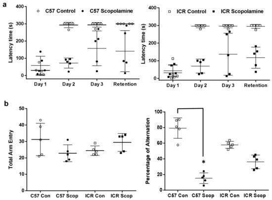 As seen in Figure 2a, the step-through latency of the C57BL/6 control group was significantly increased and retained over the daily course of acquisition-tasking compared to the scopolamine group. Alternatively, the step-through latency of the ICR control group gradually increased over the daily course of acquisition-tasking. On the second day, the scopolamine-administered group in both mouse strains (C57BL/6 and ICR) expressed a significant (F (4, 60) = 1.184; p < 0.05) reduction in step-through latency, with values of 72 ± 29 s and 70 ± 40 s, compared to 293 ± 16 s and 296 ± 9 s in the respective control groups. Subsequently, on the fourth day (retention-tasking), the control group for both strains (ICR and C57BL/6) exhibited significantly (F (4, 60) = 1.184; p < 0.05) higher latency time compared to the scopolamine-administered groups. In the Y-Maze test (Figure 2b), the scopolamine-treated group of the C57BL/6 strain exhibited significantly (F (3, 16) = 48.37; p < 0.05) lower percentage of spontaneous alternation, with a value of 15 ± 6.75% compared to the control group at 79 ± 11.73%. In contrast, the scopolamine-treated and control groups of the ICR strain exhibited a non-significant difference in spontaneous alternation percentage. In addition, no significant differences were observed among the groups of both strains C57BL/6 and ICR in terms of total arm entries with the values of control (31 ± 10 n and 24 ± 3 n) and scopolamine (23 ± 5 n and 29 ± 5 n), respectively.