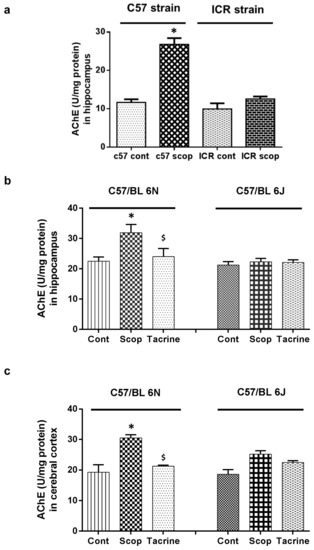 Acetylcholinesterase (AChE) activity in brain tissues of scopolamine-induced amnesic models: (a) Hippocampus of ICR and C57BL/6 strains; (b) Hippocampus and (c) cerebral cortex of C57BL/6N and C57BL/6J substrains. Data are expressed in U/mg protein as mean ± SD (n = 4). One-way ANOVA-Tukey’s multiple comparison test was performed where, * p < 0.05 scopolamine compared with the control group; $ p < 0.05 tacrine compared with scopolamine-treated group.