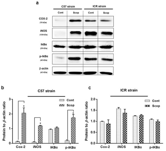 In the C57BL/6 strain (Figure 5a,b and Figures S1–S5), the hippocampus of the scopolamine-treated group exhibited significantly (F (3, 8) = 42.55; F (3, 8) = 95.54; F (3, 8) = 130.03; p < 0.05) higher levels of inflammatory protein expression, with an approximately two-fold increase in cyclooxygenase-2 (COX-2) and phosphorylated—nuclear factor of κ inhibitor (p-IκBα) levels, and a one-fold increase in inducible nitric oxide synthase (iNOS) levels compare to the control group respectively, whereas the inflammatory protein expressions in the ICR strain (Figure 5a,c) did not significantly differ among the control and scopolamine-treated groups.