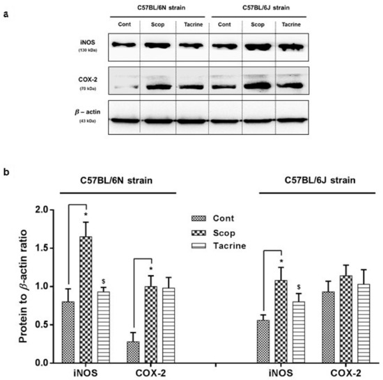Inflammatory protein markers (iNOS and COX-2) expression in the hippocampus of scopolamine-induced amnesic models—C57BL/6N and C57BL/6J substrains: (a) Western blotting of inflammatory protein expression and (b) its quantification relative to β-actin expression. Data are expressed as mean ± SD (n = 3). One-way ANOVA-Tukey’s multiple comparison test was performed where, * p < 0.05 scopolamine compared with the control group; $ p < 0.05 tacrine compared with scopolamine-treated group.