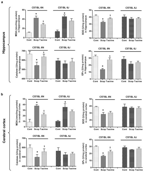 Endogenous level of oxidative stress biomarkers in brain tissue of scopolamine-induced amnesic models—C57BL/6N and C57BL/6J substrains: The lipid peroxidation (malondialdehyde, MDA) and antioxidant biomarkers (superoxide dismutase, SOD, catalase, CAT, glutathione peroxidase, GPx) levels in the (a) hippocampus and (b) cerebral cortex of mice were determined. Data are expressed as mean ± SD (n = 4; pooled biological replications). One-way ANOVA-Tukey’s multiple comparison test was performed where, * p < 0.05 scopolamine compared with the control group; $ p < 0.05 tacrine compared with scopolamine-treated group.