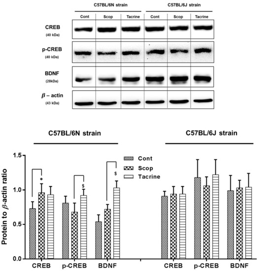 cAMP response-element binding protein (CREB)/brain-derived neurotrophic factor (BDNF) protein markers expression in the hippocampus of scopolamine-induced amnesic models—C57BL/6N and C57BL/6J substrains: Western blotting of CREB, p-CREB, and BDNF protein expression and its quantification relative to β-actin expression. Data are expressed as mean ± SD (n = 3). One-way ANOVA-Tukey’s multiple comparison test was performed where, * p < 0.05 scopolamine compared with the control group; $ p < 0.05 tacrine compared with scopolamine-treated group.