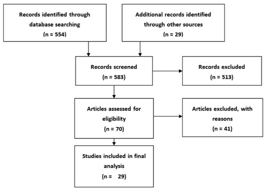 A comprehensive search of available English-language literature was carried out on PubMed. The search focused on studies describing or potentially describing diagnostic in vitro methods in severe cutaneous adverse drug reactions. The entry terms used were “in vitro”, “laboratory diagnosis”, “drug allergy”, “drug hypersensitivity”, “Stevens–Johnson Syndrome”, “SJS”, “Toxic Epidermal Necrolysis”, “Drug Reaction with Eosinophilia and Systemic Symptoms Syndrome”,” DRESS”, “Acute Generalized Exanthematous Pustulosis”, and “AGEP” and were combined using Boolean operators. The search strategy consisted of: set 1, “in vitro”, set 2, laboratory diagnosis; set 3, (“drug allergy” or “drug hypersensitivity” or “Stevens–Johnson Syndrome” or “Toxic Epidermal Necrolysis” or “SJS” or “Drug Reaction with Eosinophilia and Systemic Symptoms Syndrome” or “DRESS” or “Acute Generalized Exanthematous Pustulosis” or “AGEP”); and set 4, set 1 AND set 2 AND set 3. Searches were last updated on 7 April 2017. A total of 554 items were identified and assessed on the basis of their title and abstract or in full if no abstract was available. Forty-one were included in further analysis. An additional 29 references were identified from the bibliographies of the retrieved articles. In total, 29 articles from both groups met the eligibility criteria and were reviewed and evaluated in detail (Figure 1) [16,17,18,19,20,21,22,23,24,25,26,27,28,29,30,31,32,33,34,42,45,46,47,48,49,50,51,52,53].