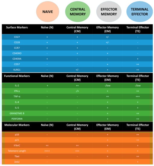 - Larbi, A.; Fulop, T. From “truly naïve” to “exhausted senescent” T cells: When markers predict functionality. Cytom. Part A 2014, 85, 25–35. [Google Scholar] [CrossRef] [PubMed]