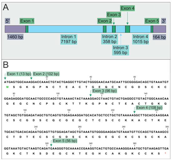 Structural organization of the Metallothionein (MT) gene from Biomphalaria glabrata. (A) Map showing the exon/intron structure of the gene. Positions and length of exons (green), introns (blue), the promoter at the 5′ end-and the 3′-untranslated region (UTR) (lilac) are specified by boxes above and underneath the gene map; (B) linked exons 1–5 (shaded in green) with starting points (green arrows) and length (in parentheses), coding for amino acid sequence of the MT protein (shown in one-letter amino acid code below base triplets).