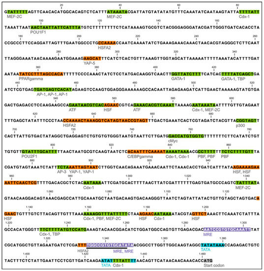- Matys, V. TRANSFAC(R) and its module TRANSCompel(R): Transcriptional gene regulation in eukaryotes. Nucleic Acids Res. 2006, 34, D108–D110. [Google Scholar] [CrossRef] [PubMed]