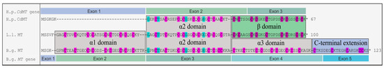 Alignment of the CdMT of Helix pomatia (H.p.) (GenBank acc. Nr.: AF399740.1), the MT of Littorina littorea (L.l.) (GenBank acc. Nr.: AY034179.1) and the MT of Biomphalaria glabrata (B.G.) (GenBank acc. Nr.: KT697617) displaying the amino acid sequence and suggested domain structure. Exon structures of the genes are shown for Helix pomatia (H.p. CdMT gene) (GenBank acc. Nr.: FJ755002.1) and for Biomphalaria glabrata (B.g. MT gene) (GenBank acc. Nr.: XM_013225031). Conserved cysteines are marked in pink. Conserved amino acid positions shared by all MTs are marked in blue. The α-domains are indicated by a grey box, β-domains by a green box and the C-terminal extension is marked by a blue box. Exon structures of the genes are indicated by colored boxes above (for H.p.) and underneath (for B.g.) the respective amino acid sequence. Additionally, the length is indicated at the end of each sequence.