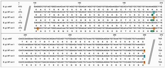 Alignment of the Biomphalaria glabrata wild-type MT (B. gl. wtMT) and its four allelic variants (B. gl. MT var 1–4). Parts of the sequence showing 100% coverage amongst all MTs were cut (two black lines). Nucleotide positions are indexed above the top sequence. Amino acids are displayed in single letter code underneath the respective base triplets and the start and stop codons are marked in grey. Nucleotide mutations are shaded in blue, single nucleotide polymorphisms (SNPs) are shaded in orange and the respective changes of amino acids are indicated by a green circle or ellipses. B. gl. MT var 1 shows a change at position 210 (G is replaced by T—changing the codon from lysine to asparagine). B. gl. MT var 2 shows SNPs at positions 210 (K: represents G or T-changing the codon to either lysine or asparagine) and 300 (S: represents G or C). B. gl. MT var 3 shows a shift at position 300 (C is replaced by G). B. gl. MT var 4 shows SNPs at positions 133 (R: represents A or G), 210 (K: represents G or T—changing the codon to either lysine or asparagine) and 300 (S: represents G or C).