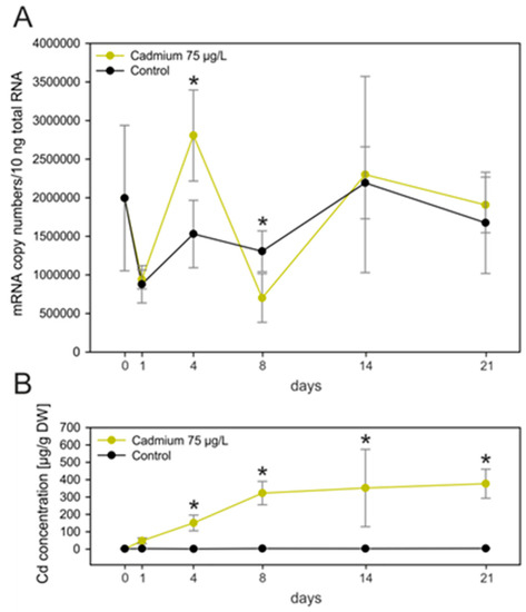 (A) MT induction pattern in the midgut gland of untreated individuals (black line) and individuals exposed to cadmium (75 µg/L) (yellow line) of Biomphalaria glabrata over a period of 21 days. Means and standard deviations are shown (n = 4). The course of MT mRNA transcription was tested by two-way analysis of variance (ANOVA) (p ≤ 0.05) but was insignificant. Stars indicate significant differences at single time points according to multiple t-test comparisons; (B) cadmium concentration in the midgut gland of Biomphalaria glabrata from controls (black line) and exposed individuals (75 µg/L Cd) (yellow line). Means and standard deviations are shown (n = 4). Two-way ANOVA (p ≤ 0.05) revealed significant differences between the two treatments. Stars indicate significant differences at single time points according to multiple t-test comparisons.