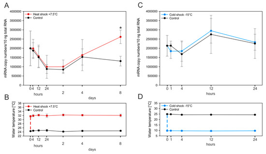 (A) MT induction and pattern in the midgut gland of Biomphalaria glabrata in untreated individuals (black line) and snails exposed to a sudden temperature increase (+7.5 °C) (red line), persisting through a period of 8 days. Means and standard deviations are shown (n = 4). The course of MT mRNA transcription levels was tested by two-way ANOVA (p ≤ 0.05) but was insignificant. The star indicates a significant difference at a single time point according to multiple t-test comparisons; (B) water temperature profile for the duration of exposure. The dotted line indicates the heat shock at day 0; (C) MT induction pattern in the midgut gland of Biomphalaria glabrata in untreated individuals (black line) and animals exposed to a sudden temperature decrease (−15 °C) (blue line), through a period of 24 h. Means and standard deviations are shown (n = 4). The course of MT mRNA transcription levels was tested by two-way ANOVA (p ≤ 0.05) but was insignificant. (D) water temperature profile for the duration of exposure. The dotted line indicates the cold shock at day 0.