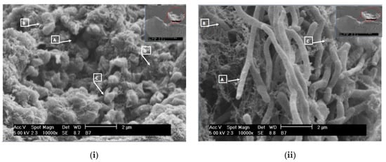 Scanning electron microscopic images of the apical of the apical foramen of a tooth showing a mature biofilm of (i) Leuconostoc spp. (10,000×). A multilayered polymeric matrix is evident. Also noticed are communicating channels in the biofilm (A), extracellular fibers secreted by bacterial cells (B), metabolically active cells characterized by cell division (C) and compact extracellular polymers (D); (ii) Biofidobacterium spp. in a maturation state (10,000×). Secretion of polymers in granular form by the bacterial cells (A), microfilaments of extracellular polymers surrounding the rod shape of the microorganism (B) and extracellular polymers in the maturation state (C) can be seen (Courtesy: Dr. Ana Maria González Amaro, Maria Verónica Méndez González, UASLP Mexico).