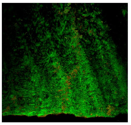 In recent years, confocal laser scanning microscopy has emerged as a very good method to study biofilms structure [], because it allows non-destructive investigation of these ecosystems and the hydrated spatial arrangement at cellular scale. The use of fluorescent markers allows targeting of particular cells or, even certain components of the extracellular matrix.