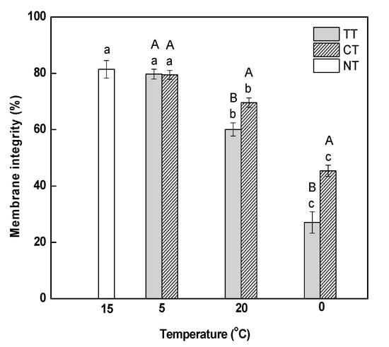 Electrolyte leakage, which reflects the effect of abiotic stress on membrane integrity, was detected using a conductivity meter. We observed that a gradual decrease in temperature from 15 to 5 °C did not affect membrane integrity in M. baccata leaves (Figure 1). Electrolyte leakage decreased continuously as the temperature increased from 5 to 20 °C and then decreased to 0 °C, which demonstrated that rapidly changing temperature brought a negative influence on the integrity of membranes in the leaves. The treatment of calcium (CT) could relieve the stress induced by rapidly-changing temperature on membrane integrity, but did not change the decreasing trend of electrolyte leakage.