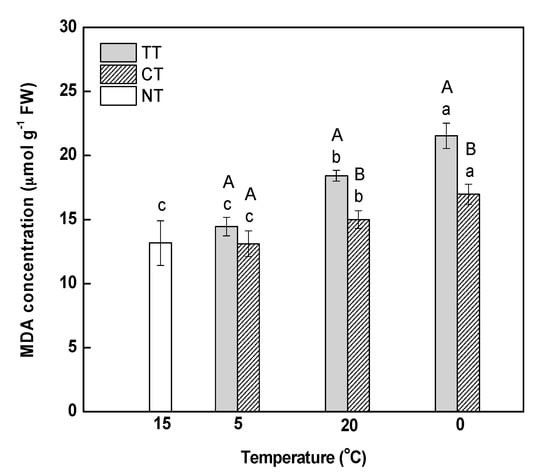 The degree of oxidative damage in leaves was examined in terms of lipid peroxidation, as reflected by malondialdehyde (MDA) content. MDA content at 5 °C was slightly higher than that at 15 °C, which indicated that a gradual decrease in temperature from 15 to 5 °C caused no obvious injury to the cell membranes of the leaves (Figure 2). MDA content under temperature treatment (TT) increased significantly by 1.27 (at 20 °C) and 1.49-fold (at 0 °C) compared to the content at 5 °C. The treatment of calcium significantly decreased the MDA content in leaves under temperature stress; however, it was still significantly higher than that in the control (NT).