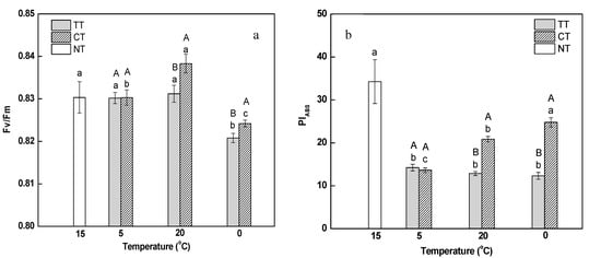 It has been reported that performance index on absorption basis (PIABS) is more sensitive than Fv/Fm to some stresses, and can reflect the effect of stress on photosynthetic apparatus better []. PIABS decreased significantly and uniformly as the temperature changed from 15 to 5 °C (Figure 3b). It was also proved that PIABS was more sensitive to the low temperature than Fv/Fm. Under calcium treatment, PIABS increased continuously during the temperature stress, and was significantly higher than that under the temperature treatment at 20 °C (by 1.62-fold) and 0 °C (by 2.01-fold). It was indicated that calcium can effectively relieve the damage caused by changing temperature stress to photosynthetic apparatus.