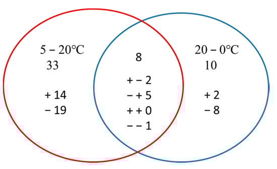 Venn diagram of differentially abundant proteins that were up or downregulated by an increase or decrease in temperature. The “+” and “−” indicate up and downregulated proteins, respectively. “+ − 2” means that, among the eight proteins, two proteins were upregulated in 5–20 °C while downregulated in 20–0 °C.