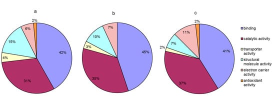 Among the 117 differentially abundant proteins, 56 were characterized as hypothetical proteins without a specific function in the database. To obtain functional information about the proteins, we used the BLAST search for homologous proteins against the NCBI non-redundant protein database []. The e-value threshold was set to less than 1 × 10−5, and the best hit for each query sequence was taken account for gene ontology (GO) term matching. All differentially abundant proteins were classified according to their molecular functions on the basis of gene ontology (GO) annotation []. The proteins that responded to a rapid increase in temperature were assigned to six functional classes: binding (42%), catalytic activity (31%), structural molecule activity (15%), electron carrier activity (6%), transporter activity (4%), and antioxidant activity (2%) (Figure 5a). Proteins responding to rapidly decreasing temperature were assigned to five functional classes: binding (45%), catalytic activity (35%), structural molecule activity (10%), electron carrier activity (7%), and transporter activity (3%) (Figure 5b). Proteins responding to the entire temperature treatment were mainly involved in binding (41%), catalytic activity (37%), electron carrier activity (11%), structural molecule activity (7%), transporter activity (2%), and antioxidant activity (2%) (Figure 5c). Proteins in the categories of binding and catalytic activity were the most responsive to the stress caused by rapid changes in temperature. However, compared to that under rapidly increasing temperature, no proteins related to antioxidant activity were found differentially expressed under decreasing temperature. After the changing temperature treatment, the number of proteins related to electron carrier activity was increased and the number of proteins that serve as structural molecules was decreased.