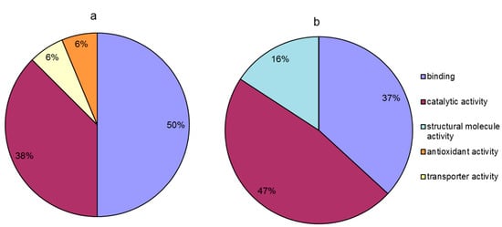 Molecular function of calcium-responsive proteins under temperature stress. (a) Calcium responsive proteins at 20 °C (20 °C + Ca vs. 20 °C); (b) calcium responsive proteins at 0 °C (0 °C + Ca vs. 0 °C).