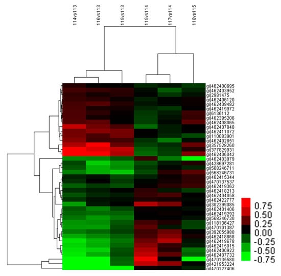 Hierarchical clustering analysis of differentially abundant proteins from M. baccata leaves under different treatments. The rows represent individual proteins. The proteins that increased and decreased in abundance are indicated in red and green, respectively. The proteins that were not changed are indicated in black. The intensity of the colors increased as the difference in abundance increased. 114 vs. 113: 5–20 °C; 116 vs. 113: 5 °C + Ca–5 °C; 115 vs. 113: 0–5 °C; 115 vs. 114: 20–0 °C; 117 vs. 114: 20 °C + Ca–20 °C; 118 vs. 115: 0 °C + Ca–0 °C.