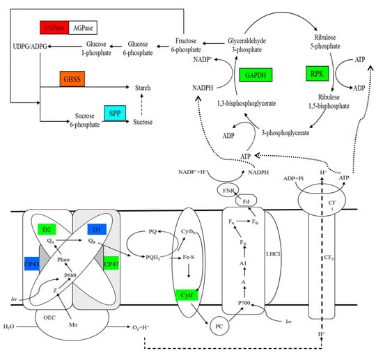 Changes in the photosynthetic electron transfer chain, Calvin cycle, and biosynthesis pathway of sucrose and starch in response to rapid changes in temperature in M. baccata leaves. The red box represents a protein only upregulated at 20 °C as compared to that at 5 °C. Green boxes indicate proteins only downregulated at 0 °C as compared to that at 5 °C. Oxford blue boxes indicate proteins downregulated at both 20 and 0 °C as compared to that at 5 °C. The light blue box indicates a protein only downregulated under calcium treatment at 0 °C. The orange box represents a protein upregulated at both 20 °C as compared to that at 5 °C, and under calcium treatment at 0 °C. AGPase, ADP-glucose pyrophosphorylase; Cytb6, cytochrome b6; Cytf, cytochrome f; FNR, ferrdoxin-NDAP + reductase; GAPDH, glyceraldehyde-3-phosphate dehydrogenase; GBSS, granule-bound starch synthase; LHCI, PSI light-harvesting complex; OEC, oxygen-evolving complex; PC, plastocyanin; Pheo, pheophytin; PQ, plastoquinone; PQH2, plastoquinol; PRK, phosphoribulokinase; and UGPase, UDP-glucose pyrophosphorylase.