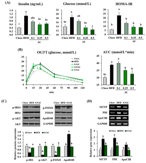 AI improves the hepatic insulin signaling pathway in mice. (A) Fasting plasma levels of insulin and glucose and homeostasis model assessment of basal insulin resistance (HOMA-IR)) index; (B) oral glucose tolerance test (OGTT) and area under the curve (AUC); (C) densitometric quantification of the phosphorylation of IRS1, AKT, FOXO, and ApoB100 in the liver; (D) hepatic expression of genes involved in VLDL assembly; Statistical analysis was performed using one-way ANOVA and analyzed further by Duncan’s multiple range test. Different letters above the bars indicate significant differences among experimental groups (p < 0.05).