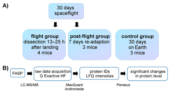 Sample overview and methodological workflow. (a) Sample overview for all three groups investigated. The control group on Earth was held in housing and climate conditions corresponding to the conditions of flight group; (b) Workflow of sample preparation, processing, and analysis. IDs—identifications; FASP—filter-aided sample preparation; LFQ—label-free quantification.