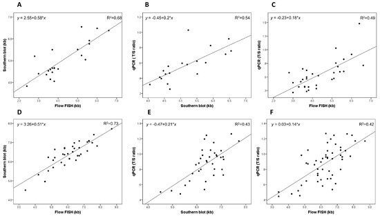 - Gutierrez-Rodrigues, F.; Santana-Lemos, B.A.; Scheucher, P.S.; Alves-Paiva, R.M.; Calado, R.T. Direct comparison of flow-fish and qPCR as diagnostic tests for telomere length measurement in humans. PLoS ONE 2014, 9, e113747. [Google Scholar] [CrossRef] [PubMed]