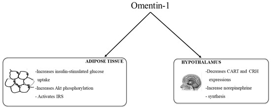 Given the above studies, scientific evidence clearly supports the role of omentin in obesity and glucose metabolism regulation. However, knowledge concerning the mechanisms involved are scarce so far. Brunetti et al. suggested that omentin could be involved in regulation of appetite. They observed that the central infusion of omentin-1 in Wistar rats (8 μg/kg body weight) did not show any acute effect on food intake, nor on the hypothalamic gene expression of agouti-related protein (AgRP), neuropeptide Y (NPY), orexin-A, amphetamine-regulated transcript (CART), corticotropin-releasing hormone (CRH) and pro-opiomelanocortin (POMC) [34]. By contrast, when omentin was administered intraperitoneally for 14 days it increased food intake (beginning on day 10) and body weight (beginning on day 12). Both in vivo and in vitro experiments showed a neuromodulatory role for omentin-1 on peptidergic and aminergic signaling. Omentin-1 reduces CART and CRH gene expression, in the hypothalamus, but no NPY, POMC, AgRP and orexin-A [35]. An increase in hypothalmic l-dopa and norepinephrine synthesis, without changes in dopamine and serotonine, was also observed [35].