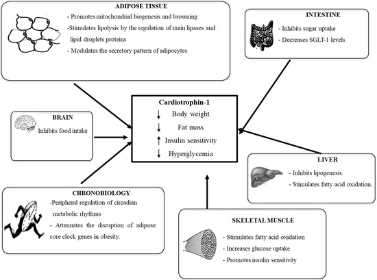 Schematic representation of the metabolic actions of cardiotrophin-1. This adipokine promotes body weight and fat mass losses, reduces hyperglycemia and increases insulin sensitivity by coordinately acting on key metabolic tissues (hypothalamus, adipose tissue, liver, intestine and muscle). SGLT-1: sodium-dependent glucose transporter 1.