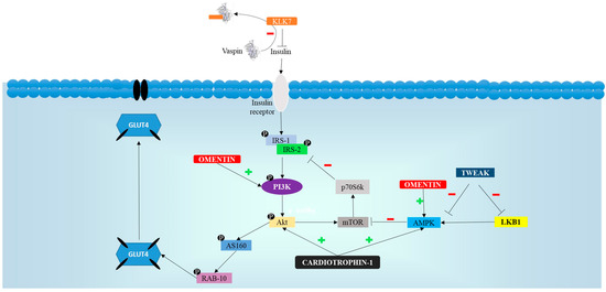 With regard to glycemic control, Yang et al. (2006) observed insulin-stimulated glucose transport by increasing protein kinase b (Akt) phosphorylation (and thus activation) in human adipocytes, suggesting that omentin may improve insulin sensitivity [7]. The researchers also observed that omentin, enhanced only insulin-mediated glucose transport and did not stimulate basal glucose transport on its own, indicating that it has no intrinsic insulin-mimic activity. In addition, omentin increased the activity of insulin receptor substrate (IRS) due to the inhibition of mammalian target of rapamicin (mTOR-p70S6K), which in turn is a consequence of AMP protein-kinase (AMPK) activation [11].