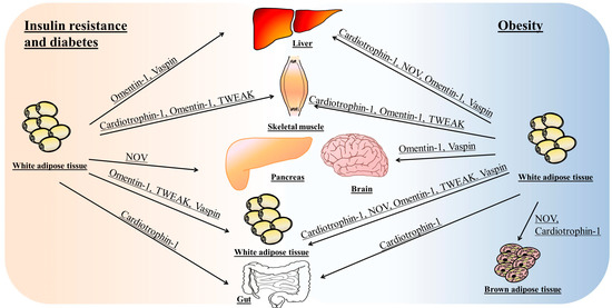 The present review focuses on several of the recently discovered adipokines, omentin-1, vaspin, cardiotrophin-1, TWEAK and NOV/CCN3. More specifically, it focuses on their relationship with obesity, insulin resistance and diabetes. In the case of omentin-1 and vaspin, the review mainly describes those studies carried out in humans. As far as rodent studies are concerned, those describing mechanisms of action have also been included in order to better characterize the actions of these adipokines. In the case on the other three adipokines, due to the small number of studies addressed in humans, those performed in rodents have also been described.