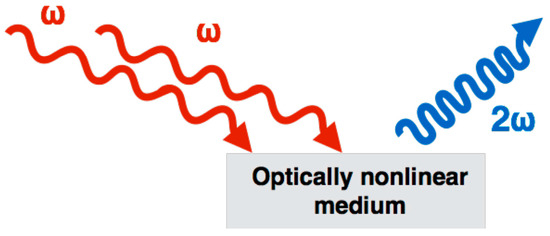 In short, SHG is a process that occurs when two photons are combined in an optically nonlinear medium, lacking in centro-symmetry (such as collagen), creating a SHG photon with a wavelength exactly half of the excitation wavelength (or twice the frequency, ), as illustrated in Figure 1.