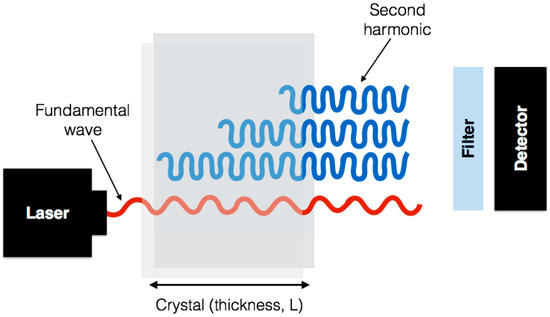 The SHG signal originates from the nonlinear polarization. The incident wave generates dipoles inside the material. These dipoles radiate at twice the frequency of the incident wave. The relative phase of the induced dipoles is fixed because the incident beam has a well-defined amplitude and phase within the material at any given point and time. The SHG signal can be obtained only if the induced dipoles radiate in phase, as illustrated in Figure 2. This phase-matching ensures that the contributions add up constructively from all positions in the material.