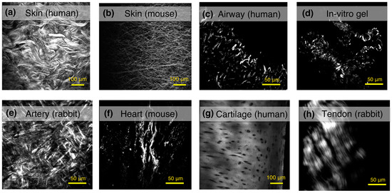 Examples of label-free SHG images from different tissue and specimens. The collagen network can be observed at the dermal layer of (a) human skin; or (b) mouse skin. The collagen deposition in human airways from a (c) human healthy donor; and (d) in vitro collagen gel model, showing fibrillar collagen synthesized by human fibroblasts from airways; (e) adventitia layer of a healthy aorta artery (rabbit); and (f) scar tissue formation in infarcted hearts from mouse; (g) human cartilage; and (h) tendons from rabbits can also be assessed using SHG imaging.