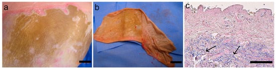 Macroscopic pictures and morphology of human eschar tissue. (a) Eschar tissue on patient; (b) Eschar after tangential excision; (c) Eschar at interface of non-viable and viable tissue from which acellular Burn Wound Extract (BWE) is derived (see Materials and Methods); hematoxylin and eosin staining showing the absence of epidermis; small, rounded cells are present in the lower levels of the dermis (areas with blue nuclei; see arrows). Scale bar = 1 cm (a,b) or 200 µm (c).