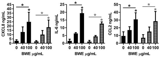 Secretion of inflammation factors by dermal- and adipose-endothelial cells. Secretion of CXCL8, IL-6 and CCL2 after a 24 h exposure to 0, 40 or 100 µg/mL BWE. Basal amounts of protein in culture medium containing 100 µg/mL BWE without cells: CXCL8: <2 ng/mL; IL-6: <1 ng/mL; CCL2: <0.5 ng/mL. Significance of the dose response curve was calculated using a one-way ANOVA followed by a Dunn’s multiple comparison test and significance of basic Fibroblast Growth Factor (bFGF) induction was tested with a t-test; * p < 0.05. Data is shown for 3 independent experiments as mean ± SEM. Each experiment represents a different cell donor and a different BWE donor (see Table 1). Black, solid bars represent dermal-endothelial cells (dermal-EC) and grey, striped bars adipose-endothelial cells (adipose-EC).