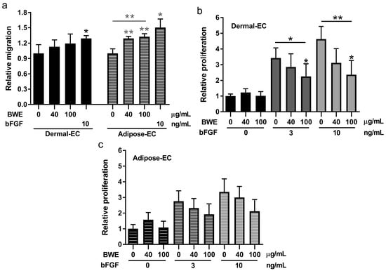 Migration scratch assay and proliferation assay using dermal- and adipose-endothelial cells. (a) Relative migration values of dermal- and adipose-EC cultured in the presence of 0, 40 or 100 µg/mL BWE or 10 ng/mL bFGF. Relative migration is calculated from the scratch area closed compared to unexposed endothelial cells; (b) Proliferation (3H incorporation) values, relative to unexposed endothelial cells, of dermal-EC cultured in the presence of 0, 3 or 10 ng/mL bFGF in combination with BWE; (c) Proliferation values, relative to unexposed endothelial cells, of adipose-EC cultured in the presence of 0, 3 or 10 ng/mL bFGF combined with BWE. Significance of the dose response curve was calculated using a one-way ANOVA followed by a Dunn’s multiple comparison test and significance of bFGF induction was tested with a t-test; * p < 0.05, ** p < 0.01. Data is shown for 4 independent experiments as mean ± SEM. Each experiment represents a different cell donor and a different BWE donor (see Table 1). Solid bars represent dermal-EC and striped bars adipose-EC.