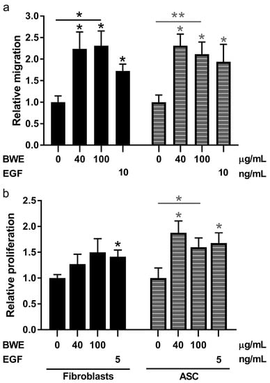 Next the influence of BWE on fibroblast and ASC proliferation and migration was investigated. In contrast to endothelial cells, fibroblasts and ASC both showed a significant increase in migration in the scratch assay in the same order of magnitude as the epidermal growth factor (EGF) positive control (Figure 5a). For fibroblasts the highest relative increase of 2.31-fold was observed using 100 µg/mL BWE whereas EGF only showed 1.73-fold increase. For ASC the highest relative increase of 2.31-fold was observed using 40 µg/mL BWE whereas EGF only showed 1.94-fold increase. The morphology of the cells was not affected by the addition of BWE (Supplementary Figure S1b). BWE stimulated proliferation of fibroblasts and ASC, to the same extent as EGF (5 ng/mL) (Figure 5b). For fibroblasts the highest relative increase of 1.50-fold using 100 µg/mL BWE was observed whereas EGF showed 1.42-fold increase. For ASC the highest relative increase of 1.88 fold using 40 µg/mL BWE was observed whereas EGF showed 1.68 fold increase.