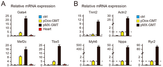 Cardiac reprogramming is more efficient using pMX-GMT (a Mixture of pMX-Gata4, -Mef2c, and -Tbx5) than that using pDox-GMT (a Mixture of pDox-Gata4, -Mef2c, and -Tbx5). (A) qRT-PCR for Gata4, Mef2c, and Tbx5 expression in mouse embryonic fibroblasts (MEFs), pDox-GMT-transduced MEFs, pMX-GMT-transduced MEFs, and heart tissue (n = 3, independent triplicate experiments). Data were normalized to the values of heart tissue (the dash lines); (B) qRT-PCR for TnnT2, Myh6, Nppa, and Ryr2 mRNA expression in mouse embryonic fibroblasts (MEFs), pDox-GMT-transduced MEFs and pMX-GMT-transduced MEFs after one week (n = 3 independent triplicate experiments). Data were normalized to the values of pDox-GMT-transduced MEFs (the dash lines); (C) FACS analyses of cardiac troponin T (cTnT) expression induced by pDox-GMT in the presence of Dox or pMX-GMT after one week; (D) quantitative data of (C) (n = 3 independent triplicate experiments); (E) immunocytochemistry for α-actinin in pDox-GMT-transduced MEFs in the presence of Dox, and pMX-GMT-transduced MEFs, after four weeks. The high-magnification views in the insets show the sarcomeric organization; (F) quantitation of α-actinin-positive cells (n = 3 independent triplicate experiments). All data are presented as mean ± SD. * p < 0.05, ** p < 0.01 vs. the relevant control. The scale bars represent 100 µm.