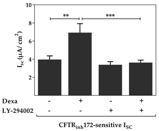 Phosphoinositide 3-kinase (PI3K) contributes to the increased cystic fibrosis transmembrane conductance regulator (CFTR) activity induced by dexa. Primary airway epithelial cells were treated with 100 nM dexa and LY-294002 (10 µM) for 24 h. Data bars represent mean + standard error of the mean (SEM) of ISC. Dexa increased the CFTRinh172-sensitive ISC. Addition of LY-294002 prevented the dexa-induced increase of CFTR activity (n = 20–25, ** p < 0.01, *** p < 0.001, analysis of variance (ANOVA) with Tukey’s post hoc test).
