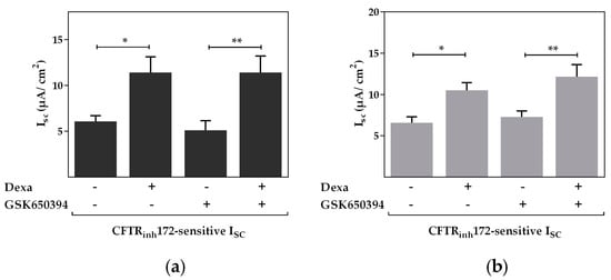Serum and glucocorticoid dependent kinase 1 activity is not involved in the dexa-stimulated CFTR activity. Cells were treated with 100 nM dexa and GSK650394 (10 µM) for 24 h. Data bars represent mean + SEM of ISC. (a) In primary airway epithelial cells, the CFTRinh172-sensitive ISC was increased by dexa. Addition of GSK650394 displayed no effect on the dexa-induced increase of CFTR activity (n = 10–15, * p < 0.05, ** p < 0.01, ANOVA with Tukey’s post hoc test); (b) in Calu-3 cells CFTRinh172-sensitive ISC was increased by dexa. In agreement, GSK650394 displayed no effect on the dexa-induced increase of CFTR activity (n = 24–31, * p < 0.05, ** p < 0.01, ANOVA with Tukey’s post hoc test).
