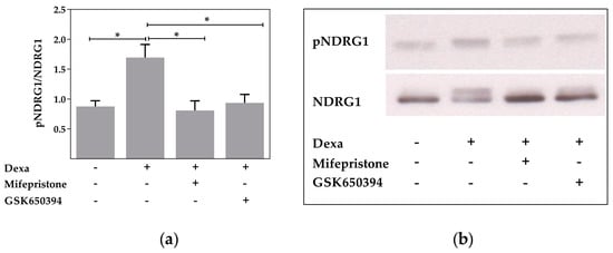 It is known that SGK1 activity is elevated by GC exposure. Western blot measurements showed that dexa significantly increased phosphorylation of n-myc downregulated gene 1 (NDRG1), a specific substrate of SGK1, and thus representing an elevated SGK1 enzyme activity compared with control cells (p < 0.05, Figure 3a). Therefore, the results do support an activation of SGK1 by dexa. However, both the addition of mifepristone to inhibit the GR and GSK650394 suppressed the increased SGK1 activity induced by dexa, as shown by a significant reduction of phosphorylated NDRG1, which reached unstimulated control levels (p < 0.05, Figure 3a,b). The Western blot measurement therefore shows that dexa increases SGK1 activity and that GSK650394 is effective in blocking SGK1 activation by dexa. Since the effect of dexa in Ussing chamber measurements persisted after the application of GSK650394, the activity of SGK1 is not decisively involved in dexa-stimulated CFTR activity.