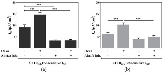 Akt1/2 kinase inhibitor prevents the increase of CFTR activity induced by dexa. Cells were treated with 100 nM dexa and Akt1/2 kinase inhibitor (10 µM) for 24 h. Data bars represent the mean + SEM of ISC. (a) In primary airway epithelial cells, the CFTRinh172-sensitive ISC was increased by dexa. Addition of Akt1/2 kinase inhibitor prevented the dexa-induced increase of CFTR activity (n = 11–14; *** p < 0.001, ANOVA with Tukey’s post hoc test); (b) in Calu-3 cells the CFTRinh172-sensitive ISC was increased by dexa. Likewise, addition of Akt1/2 kinase inhibitor prevented the dexa-induced increase of CFTR activity (n = 36–37, *** p < 0.001, ANOVA with Tukey’s post hoc test).