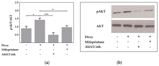 To verify an involvement of AKT in the stimulation by dexa, we analyzed the phosphorylation of AKT with Western blot. Western blot measurements showed that dexa significantly increased phosphorylation of AKT at Ser473, representing an elevated AKT enzyme activity (p < 0.05, Figure 5a,b). Both the addition of mifepristone and Akt1/2 kinase inhibitor blocked the increased AKT activity induced by dexa, as shown by a significant reduction of phosphorylated AKT, which reached unstimulated control levels (p < 0.05, p < 0.001, Figure 5a,b). The Western blot measurement therefore shows that dexa increases AKT activity and that both, Akt1/2 kinase inhibitor and GR inhibition are effective in blocking AKT activation by dexa.