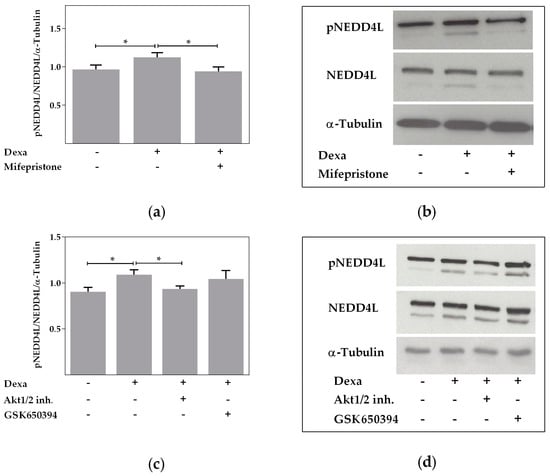 Dexa increases phosphorylation of neural precursor cell expressed, developmentally downregulated 4-like (NEDD4L). (a) Normalized densitometric evaluation of pNEDD4L, NEDD4L and α-tubulin Western blots. Calu-3 cells were treated with 100 nM dexa and mifepristone (10 µM) for 24 h (n = 5; * p < 0.05 by t-test); (b) western blot of pNEDD4L and total NEDD4L resulted in bands of 110 and 135 kDa. Western blot of α-tubulin resulted in bands of 52 kDa; (c) normalized densitometric evaluation of pNEDD4L, NEDD4L and α-tubulin Western blots. Calu-3 cells were treated with 100 nM dexa and Akt1/2 kinase inhibitor (10 µM) or GSK650394 (10 µM) for 24 h (n = 5; * p < 0.05 by t-test); (d) western blot of pNEDD4L and total NEDD4L resulted in bands of 110 and 135 kDa. Western blot of α-tubulin resulted in bands of 52 kDa.