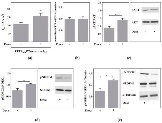 Rapid effects of dexa on CFTR activity. Calu-3 cells were treated with 100 nM dexa for 30 min. Data bars represent the mean + SEM. (a) The CFTRinh172-sensitive ISC was significantly increased by dexa (n = 60, * p < 0.05 by t-test with Welch’s correction); (b) CFTR mRNA expression was not affected by dexa (n = 6); (c) normalized densitometric evaluation of pAKT and AKT Western blots (n = 3; * p < 0.05 by t-test). Western blot of pAKT and total AKT resulted in bands of 60 kDa; (d) normalized densitometric evaluation of pNDRG1 and NDRG1 Western blots (n = 3; * p < 0.05 by t-test). Western blot of pNDRG1 and total NDRG1 resulted in bands of 46 and 48 kDa; (e) normalized densitometric evaluation of pNEDD4L, NEDD4L and α-tubulin Western blots (n = 3; * p < 0.05 by t-test). Western blot of pNEDD4L and total NEDD4L resulted in bands of 110 and 135 kDa. Western blot of α-tubulin resulted in bands of 52 kDa.