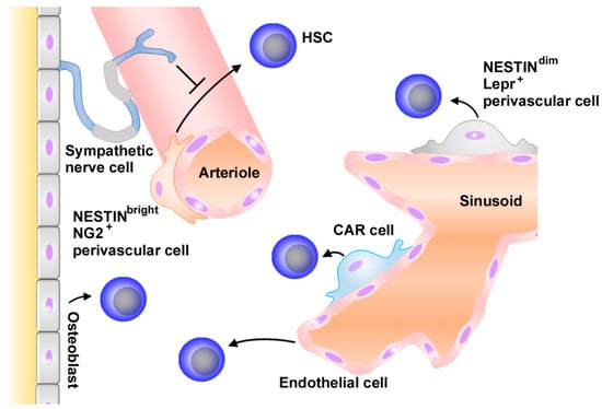 Schematic structure of hematopoietic niche. Hematopoietic stem cells (HSCs) are found adjacent to sinusoids and arterioles throughout the bone marrow. In sinusoids, endothelial cells, CXCL12-abundant reticular (CAR) cells, and NestindimLepr+ perivascular cells promote HSC maintenance. NestinbrightNG+ perivascular cells adjacent to arterioles support HSCs. Sympathetic cells contribute to HSC maintenance by directly regulating CXCL12 expression by MSCs. Hematopoiesis can also be regulated by other types of cells such as osteoblasts. Arrows and “T” indicate stimulating and suppressive activities, respesctively.